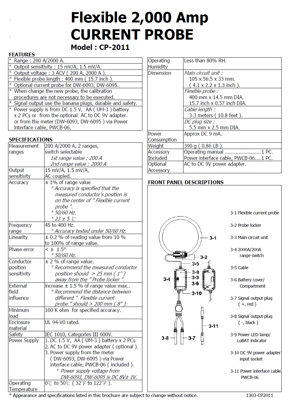Product Name : | 2,000A FLEXIBLE CURRENT PROBE Model : CP-2011 (200A / 2000 A 電流鉗表) |
