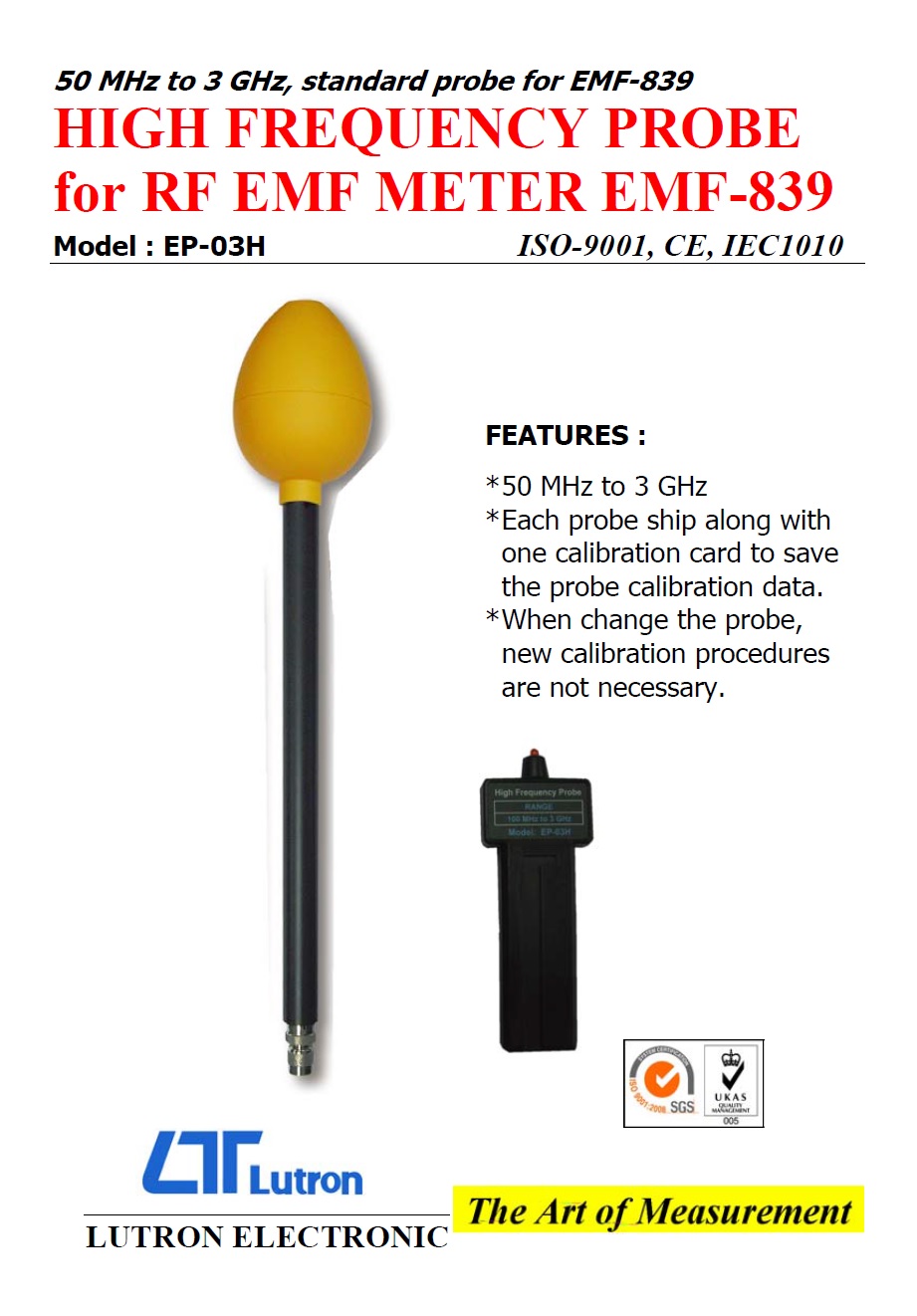 Product Name : | HIGH FREQUENCY PROBE for RF EMF METER EMF-839 Model : EP-03H 感測器 / 探棒 |