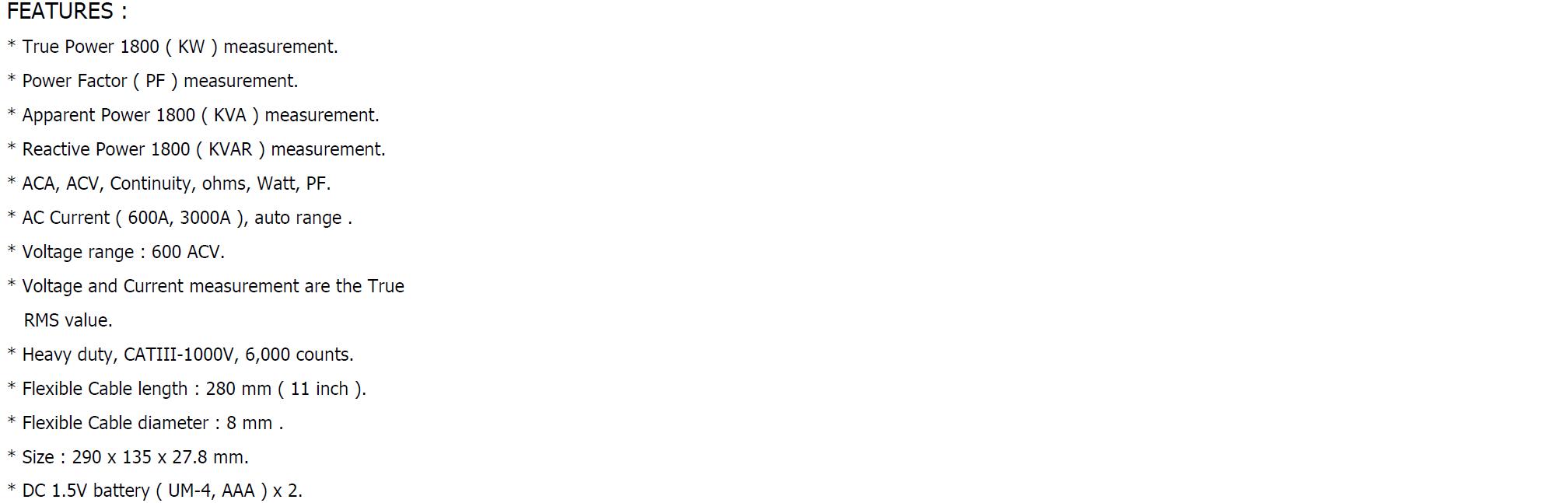 * ACA, ACV, Continuity, ohms, Watt, PF.