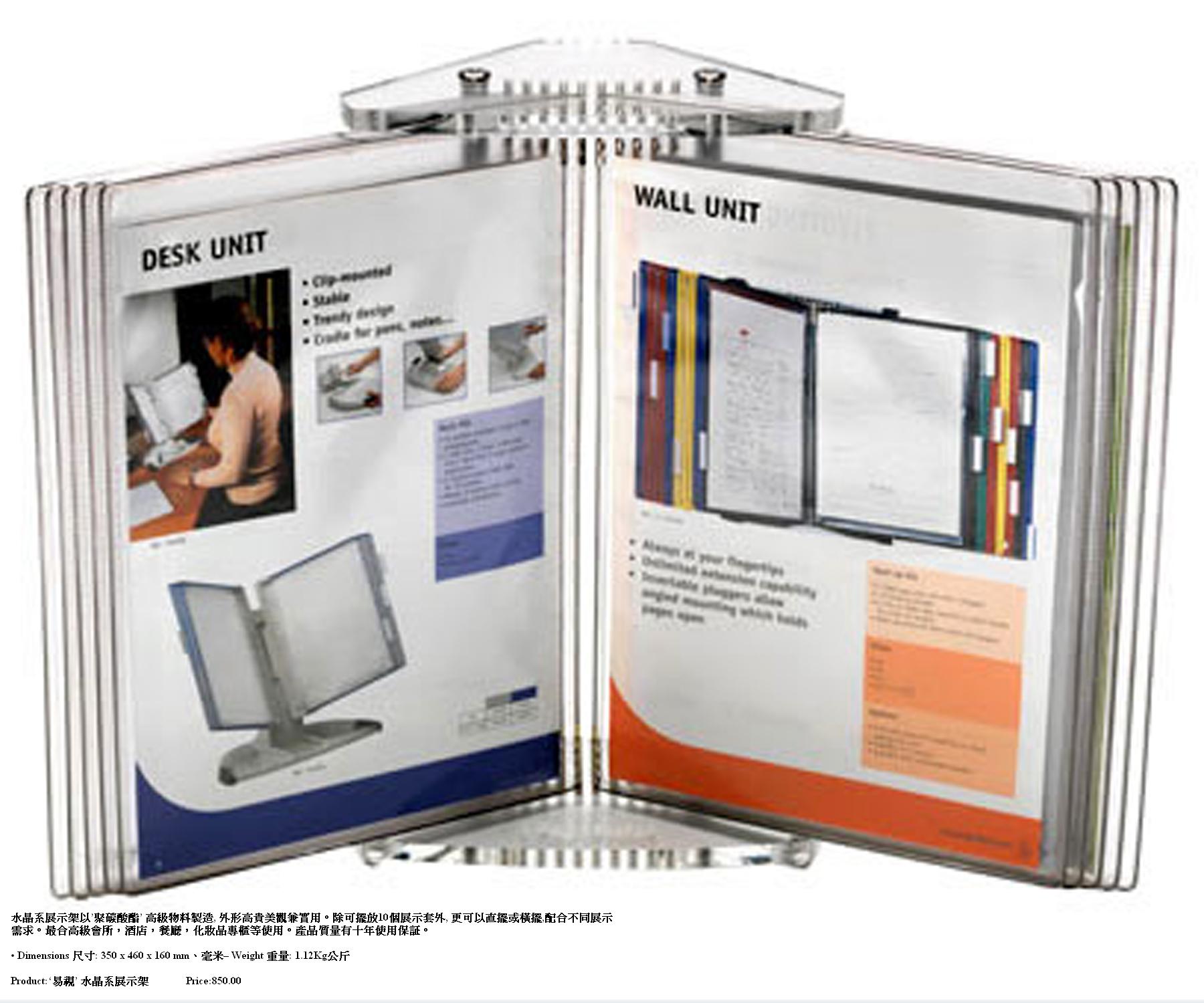 水晶系展示架以’聚碳酸酯’ 高級物料製造, 外形高貴美觀兼實用。除可擺放10個展示套外, 更可以直擺或橫擺, 配合不同展示需求。最合高級會所,酒店,餐廳,化妝品專櫃等使用。產品質量有十年使用保証。