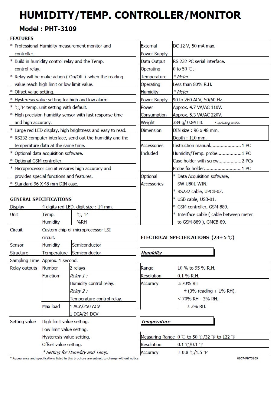 Product Name : | HUMIDITY/TEMP. CONTROLLER/MONITOR - PHT-3109 溫濕度控制顯示錶 |