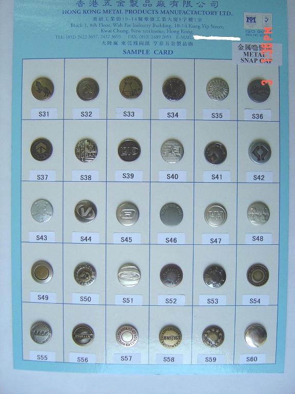 | Contact Details : | 香港五金製品廠有限公司 Hong Kong Metal Products Mfy. Ltd . . . . .東莞市駿雅鈕扣有限公司 Dong Guan Junya Matel Button Co., Ltd. | |