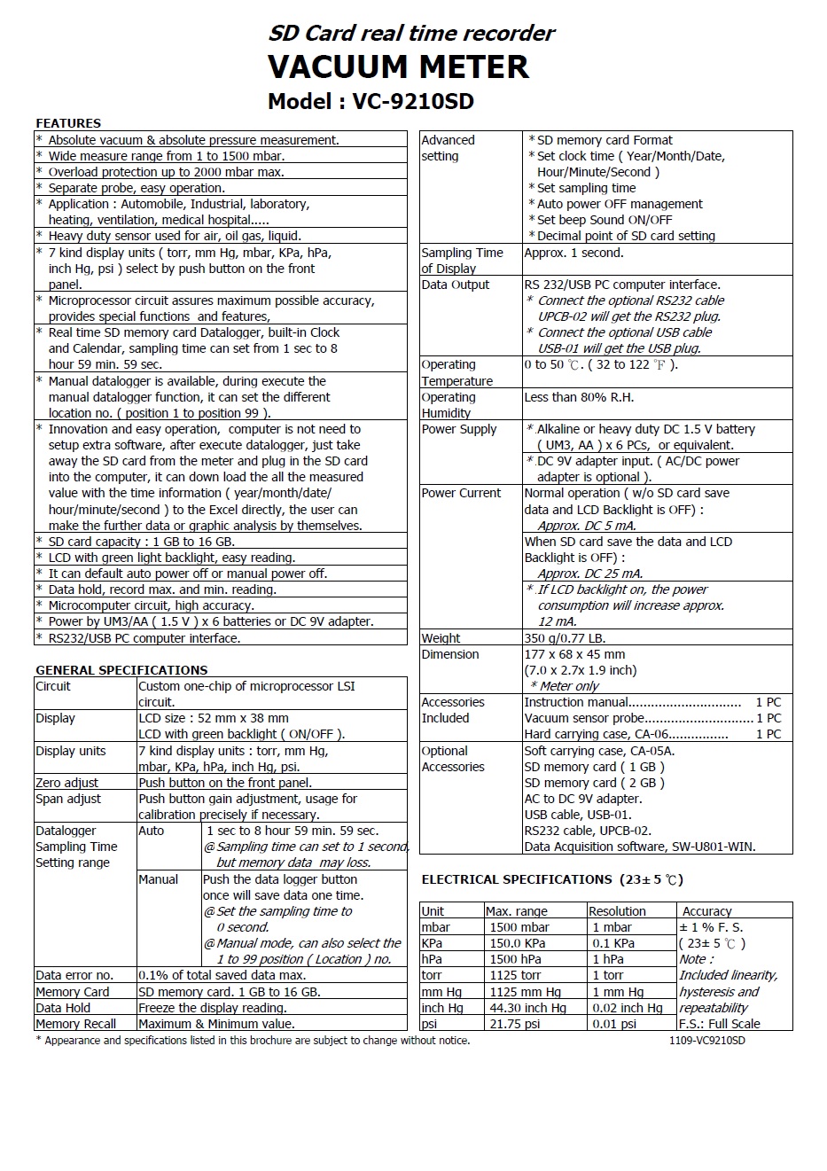 Product Name : | VACUUM METER - SD Card real time recorder - VC-9210SD 記憶式真空壓力計 |