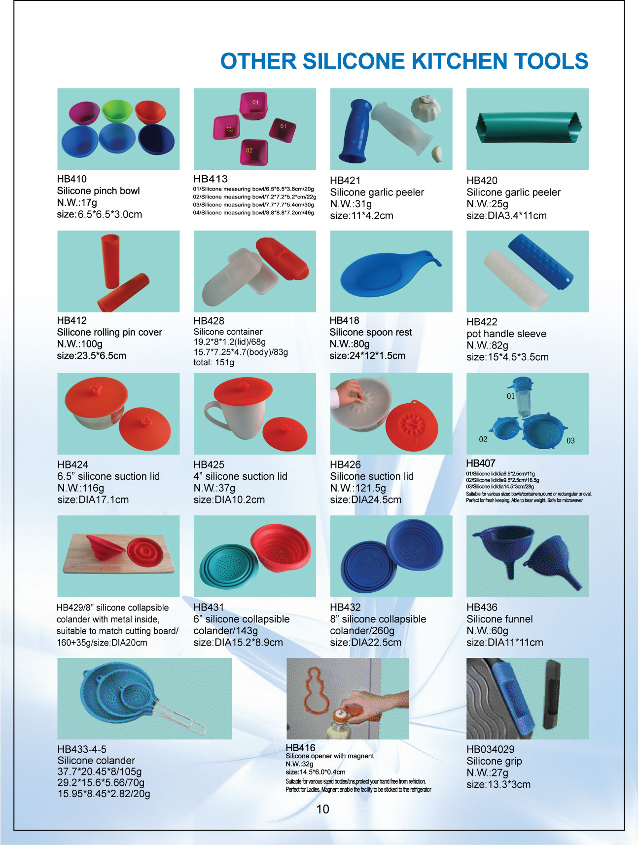 Our main products include silicone kitchenware, bakeware, baking moulds, muffin pan, pie pan, bundt pan, cake moulds, trivets, pot holders, gloves, brushes, kitchen scales, mats, coasters, cookie cutters, seals, tubes, spatulas, lid, keystrokes, grabbers, hot pads, colanders, turners, spoons, buckets, magnets, automobiles fittings, and other daily commodities.
